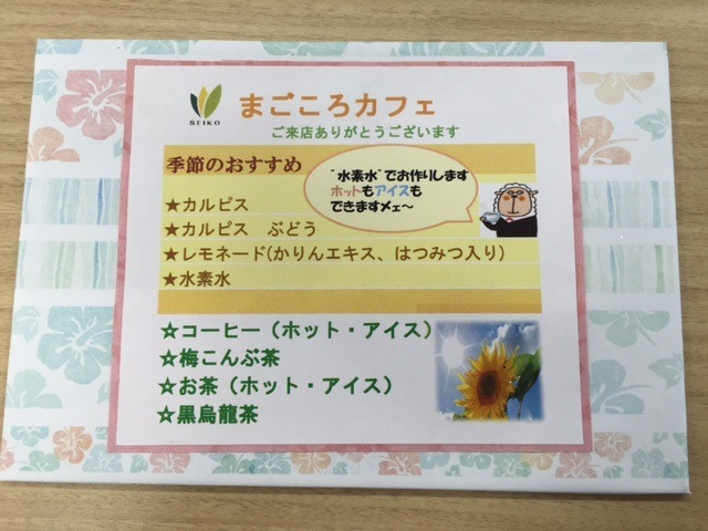![]() まごころカフェより・・・ 季節の美味しいドリンクご用意しております。 この夏おすすめは、 ジャン!! カルピス です。 今話題の水素水でお作りしますよ( ゚Д゚) 「懐かしいわ〜。カラ-ンコロ-ン」 (氷の音) お客様よりそんなお言葉を頂いております。 毎日暑い日が続いておりますが、まごころカフェでゆったりと過ごしてみませんか?? 皆様のご来店、お待ちしております。 白潟 |