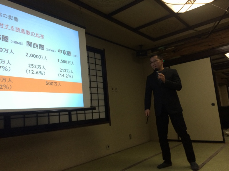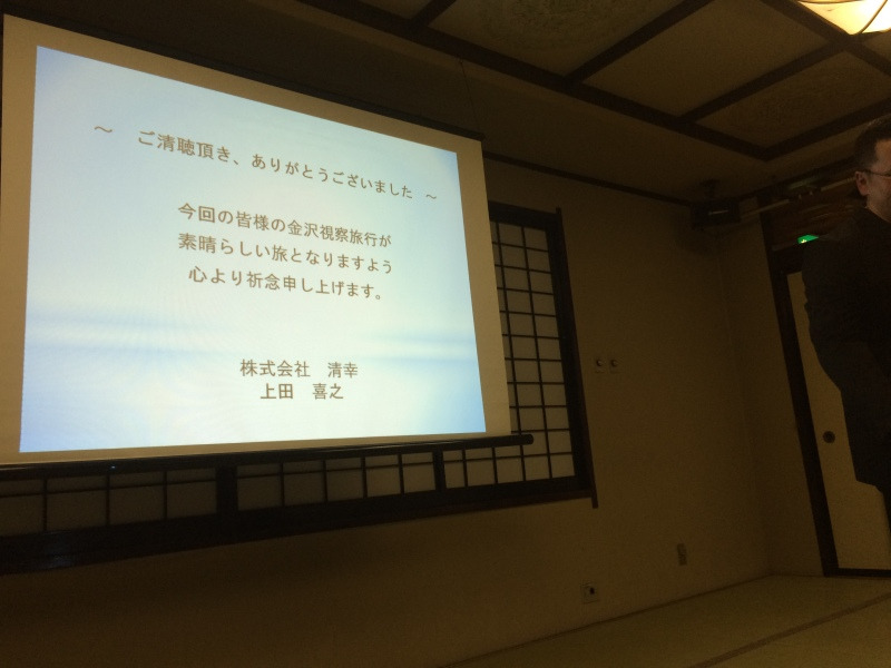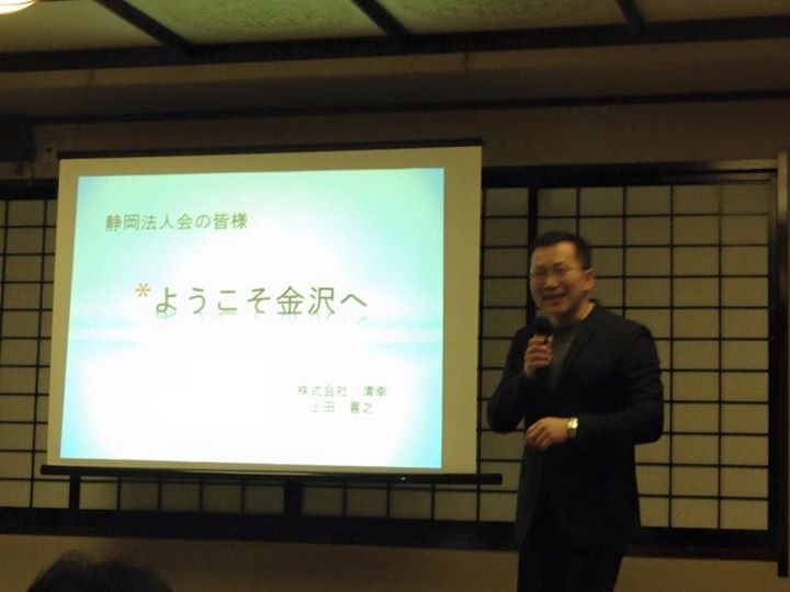 視察旅行にいらっしゃいました。 早朝からバスで約6時間、経営者の方々を中心に約50名の皆様です (^-^)/ あるご縁から、夜の懇親会に出口と一緒に、ゲストとしてご招待を頂きました。 ゲスト・・・素人の私達が金沢や北陸新幹線のことを紹介する役割りです (;^_^A 事前に石川県庁へ行き、資料や情報を集めてのプレゼンです。 ![]() 慣れないながらも、 ・金沢について ・北陸新幹線について ・新幹線開業の影響 などをお話しさせて頂きました。 ![]() ![]() 一通りの説明が終わると、 次は質疑応答です。 ![]() 恥ずかしながら・・・ 改めて、金沢のことを学びました。 出口もしっかり答えてくれました さアーーーーー 、宴会です 多くの皆様と楽しい時間をご一緒させて頂きました。 ![]() 静岡法人会の皆様 北陸新幹線開業後の金沢へも 是非、お越しくださいね〜 |