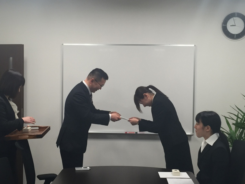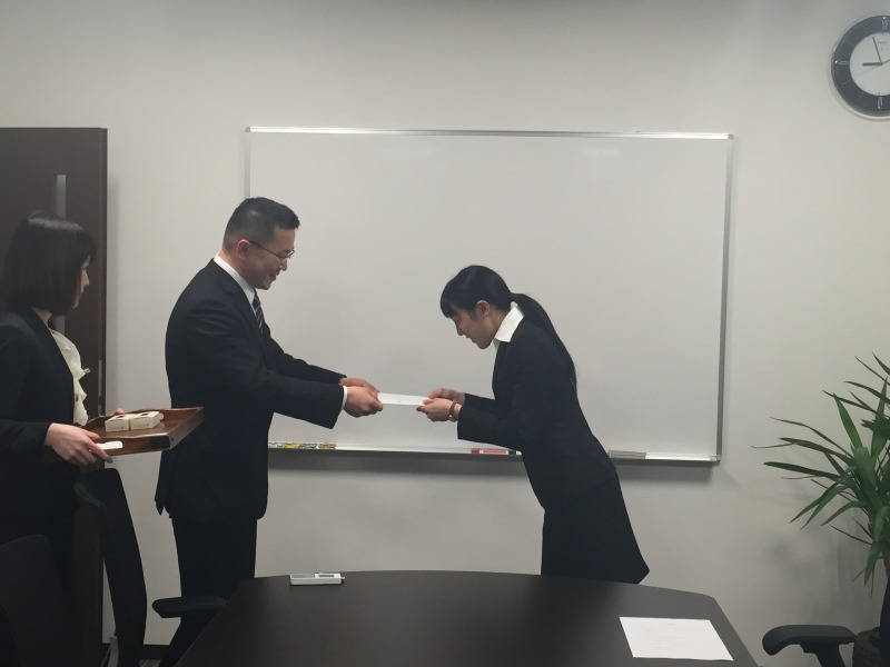 今春、大学を卒業した2名が入社する日です。 この日を待ちわびたように、玄関の桜も昨日から開花しだして、 今朝はほぼ満開となりました。 メンバー全員も二人を歓迎です。 ![]() (写真、最左?吉田、最右?村上 です) 二人の入社式 を行いました ☆訓示 私は入社前研修(3回)において、社会人として大切なことを伝えてきました。 今日はビジネスの上で大切なこととして、 「志を高く」と「挑戦」について話をしました。 ☆辞令交付 ![]() ![]() メンバー全員からのお祝いや歓迎の言葉が送られた後、 ☆新入社員あいさつ ![]() ![]() ![]() ☆記念撮影 今後にワクワク ![]() みんなでがんばるぞ! ![]() --------------------------------------------- 初日は全員でランチしました。 ![]() 何か、シュワシュワっとしたものがあった方が・・・という意見で。。 ![]() (あっ、勿論 ノンアルコールです・・・) そして、乾杯!!! ![]() 若い力は、会社を活性化し、進化させると信じています。 村上と吉田、二人の益々の成長と今後の活躍が楽しみです。 皆様どうぞ、よろしくお願いいたします。 |