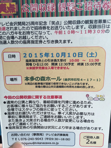 日曜日の夕方・・・私はいつも 笑点です。 (ちびまるこちゃん、サザエさん と続きますが) 先日、金沢公開収録の観覧に当選!!ヤッター ![]() 金沢の収録は10年ぶりです(^.^) 応募総数 1万3千通 なんと 倍率 8.7倍 プレミアチケット これで運を使った皆様は、きっと年末の宝くじは当たらないでしょう・・・( 笑爆発) テレビ金沢の社長様よりご挨拶があり、楽しくスタート 前座の 三遊亭 愛楽さん ![]() 大喜利メンバーが大好きな私ですが、この日 愛楽さんのファンに 収録の合間のおしゃべりが最高。会場を一体にして盛り上げる力、素晴らしすぎマス。 演芸も楽しみにしておりまして、、なんと アンガールズ さんと ビッグスモールン さん これも会場は大盛り上がり 歌丸さんの病気ネタ 木久扇さんの ラーメンネタ (8番らーめんも登場) たい平さんの、生ふなっしー 定番の笑いもあり 新幹線・加賀鳶など、大喜利の問題は金沢らしさ満載 11月8日・15日に放映、お楽しみです。 夕方・・・・・・・・・・ ![]() 白山市竹松町 キリンビール北陸工場跡地に建設中のジャパンディスプレイが今、話題です。 日中は、カニの足のようですが、夜は素敵な夜景となっています。 竹松公園から撮影してみました。 都会を感じる風景に、 「 ずっと このままで いいがに・・・・・ !? 。 」 娘の一言でありました。 |