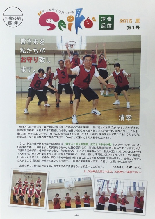 飲めるようになった吉田です。 みなさん!突然ですが、 2015年7月29日はなんの日でしょうか? それは・・・ そうっ!!!!! 「清幸通信」発送の日です!! ![]() ( ↑ 清幸通信表紙) もうすでにお手元に届いた方もいらっしゃるかと思います 西念にお引越しをしてから初の通信です☆゛ 私にとっても初の通信ということで、ワクワクの連発でした 袋詰めは大変でしたが、一つ一つに感謝の気持ちを込めましたっ(*^-^)b 皆様のお手元に早く届くといいなぁ〜(〃∇〃) 通信を発送して間もないですが、何件か感想のお電話を頂きました! ありがとうございます(´∀`) これからも清幸をよろしくお願いいたします(^O^) ゚・*:.。..。.:*・゚゚・*:.。..。.:*・゚ ゚・*:.。..。.:*・゚゚・*:.。..。.:*・゚ 話はガラッと変わりまして、 私は最近仕事の後に、バスケ やはり16年続けてきたものはなかなかやめられませんね(-_☆) 8月8日、9日に市町村対抗の ”石川県民体育大会”というものが七尾市で開催されます。 そこに白山市の一般女子の部に参加させていただくことになりました! やはり勝負事には負けたくありませんね・・・ 出るからには勝ちたいっ(゙ `-´)/ ということで、練習に励んでおります<`ヘ´> ・・・と言いたいところですが、なかなか練習ができていません(゚-゚i) 今日は貴重な練習日っ!! 大会に向けて頑張るぞ〜(。・ω・)ノ゙ (ついでに痩せないかな〜...。) ![]() (ほんとはもっといい写真を撮りたかった・・・(p_q) |