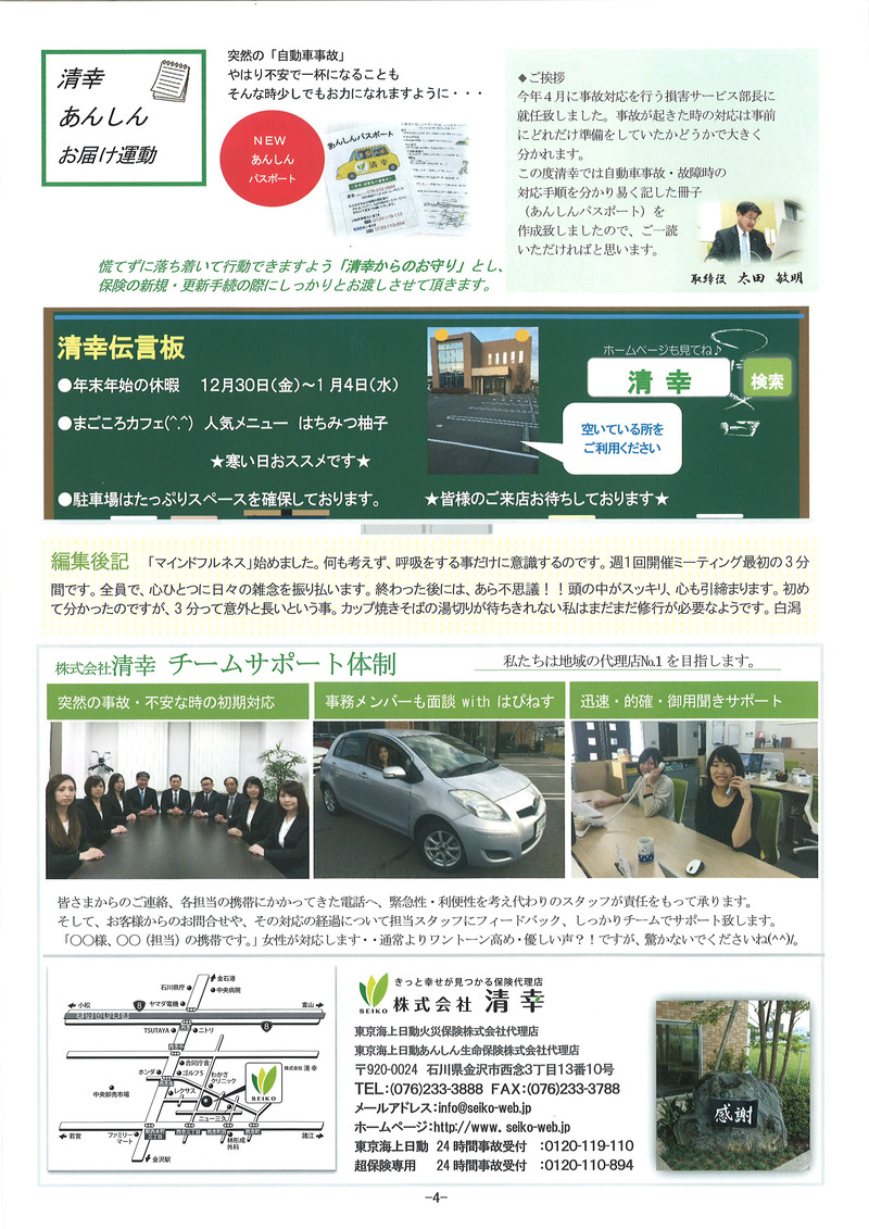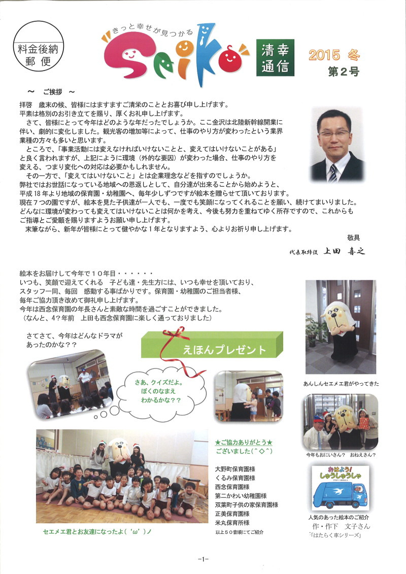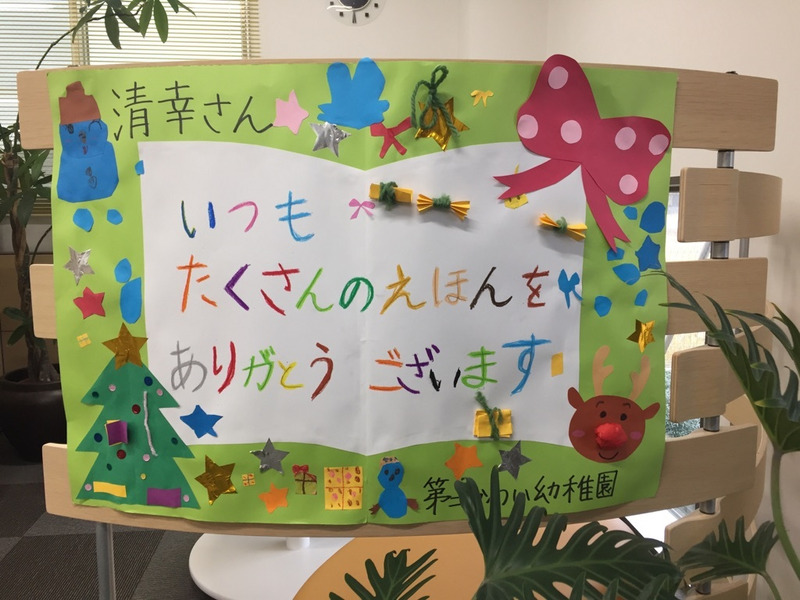 12月も残り僅かとなりました。 北陸では珍しく今日はとてもいいお天気です^^ 弊社では『清幸通信 第4号』を発送させていただきました☆ すでにお手元に届いている方もいらっしゃるかと思います。 まだの方はしばらくお待ちくださいませ。 今回も多くの方々のご協力のおかげで、 無事発送することが出来ました。 有難うございました。 あらたに清幸の取り組みとして、 『お客さまアンケート』や『あんしんパスポート』などもはじめました☆ 清幸全員で皆さまをお守りしてまいります。 ![]() ![]() ![]() ![]() と、 サプライズのはずが、 昨日は絵本を幼稚園・保育園にお届けに行き、 とてもうれしいことが(´∀`) わざわざ私たちを園児達に紹介して下さったり、手作りのお礼状や、お届けした絵本の中から一冊『ひとりぼっちのおさかなくん』というお話の読み聞かせをしていただきました。 新しい絵本にきらきらした顔の子どもたち・・・ 絵本は深い! オチが子ども達の予想と違っていたようです。 子ども達:「え〜、なんでや!!」 園長先生:「夢中になるのもいいけど、小さい子にも見せんなんよ」 粟と西も童心にかえって(!?)、かわいい子ども達と一緒に楽しいひと時を過ごしました。有難うございました ![]() 大野町保育園さま 「いつも絵本をありがとうございます!」 とみんなでお礼をしてくれました(^∇^) こちらこそ有難う♪清幸が温かくなりました^^ ![]() 第二かわい幼稚園さま |
