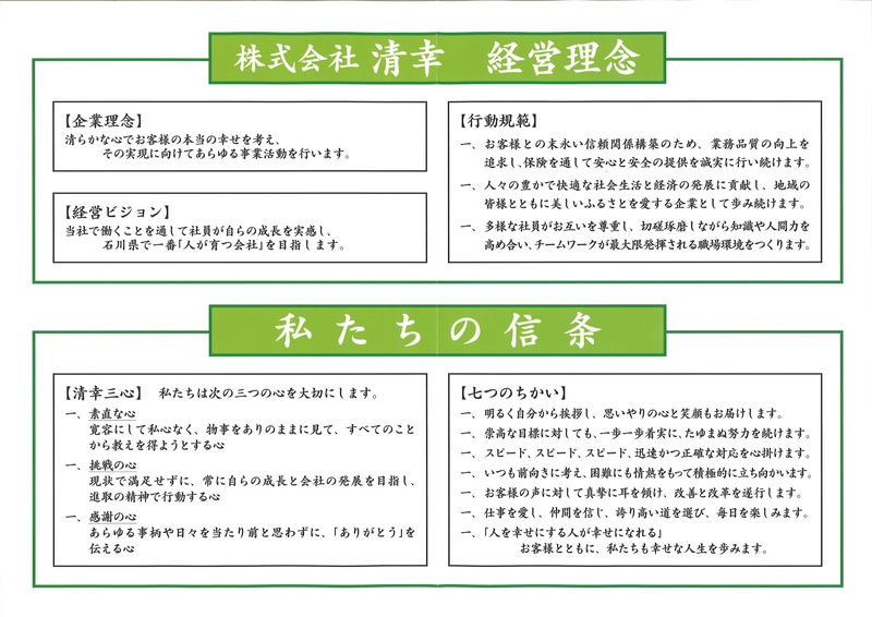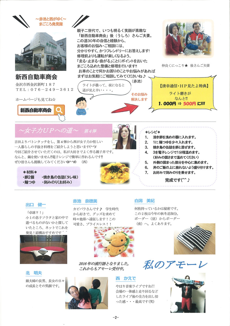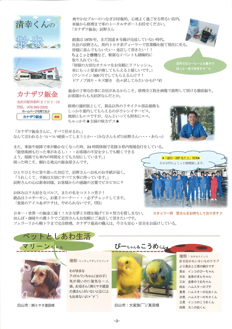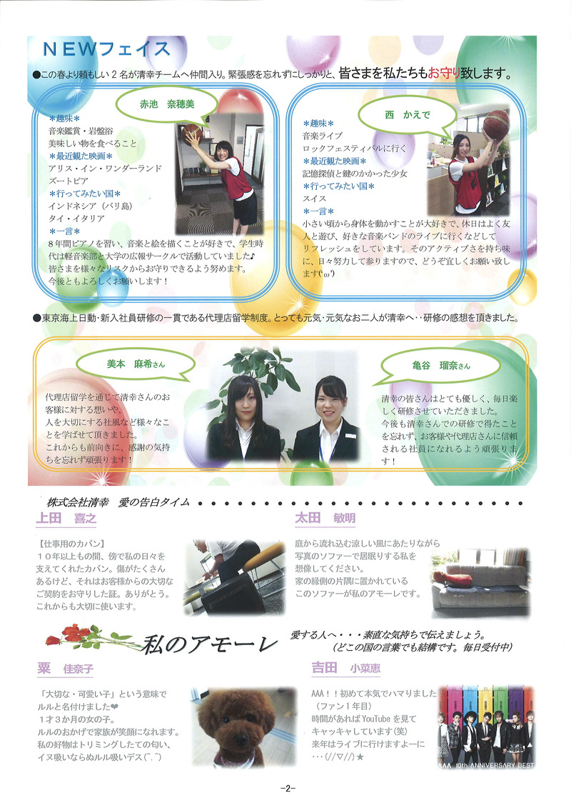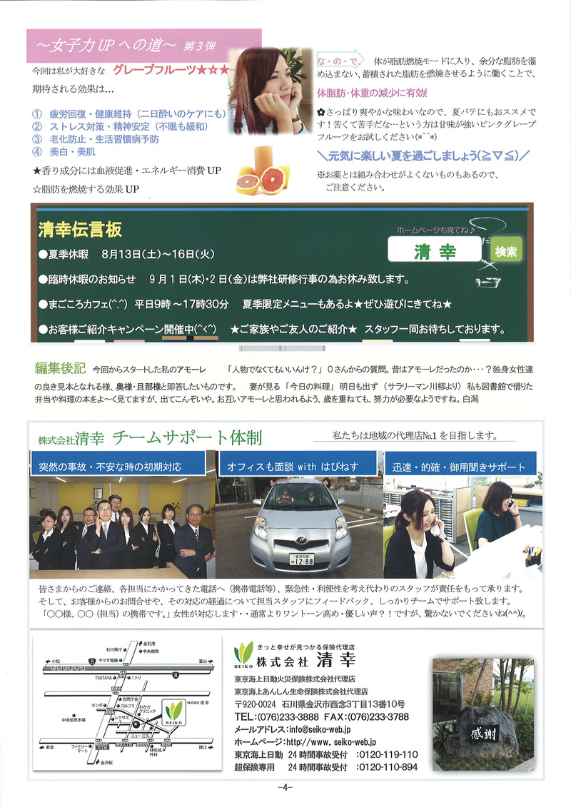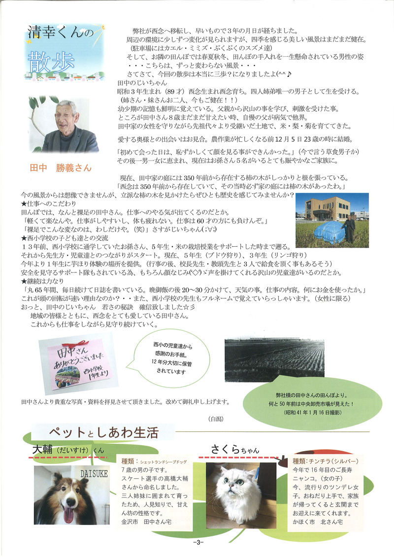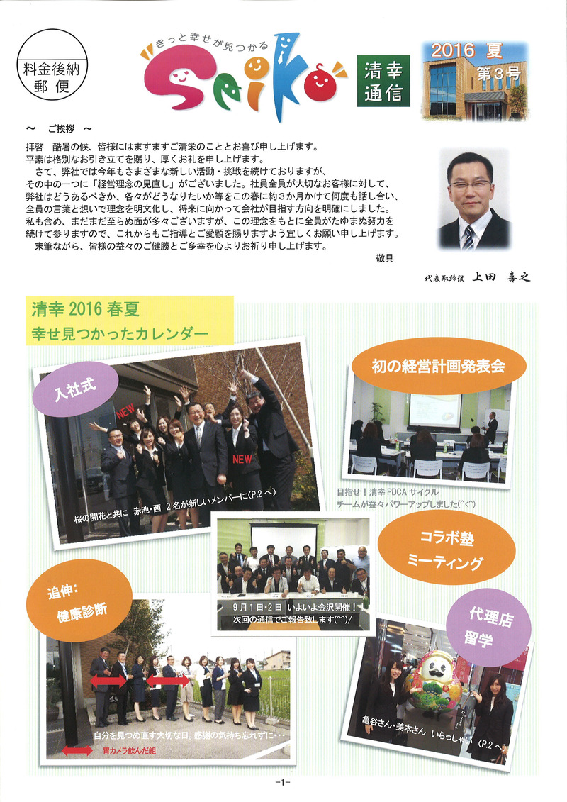 北陸地方も22日に梅雨明けをしたようですね! 『今年はあまり雨が降らない梅雨らしくない梅雨だったぞ(^J^)』 と思いきや、今朝の土砂降りは凄かったですね・・・(笑) ちょうど通勤ラッシュの時間帯でしたが 皆さま大丈夫でしたでしょうか? 私は毎日徒歩で通勤をしているのですが 傘が全く役に立たず、人生で初めて合羽がほしいと心から思いました(笑) さて、清幸では先月の終わりから 清幸通信3号の準備を進めてきました。 昨日、無事発送することができ もう既にお手元に届いている方もいらっしゃるのではないでしょうか? 新人の赤池さんと私は、通信の発送準備をするのが初めてのため 袋詰めや宛名貼り、テープをはがして封をするなど 延々と終わらない作業にとてもまいりました(笑) そこで登場したのが白潟さんのお子様(^^♪ 1日事務所で発送準備を手伝ってくれました! それだけではなく、毎朝行う朝礼での職場の教養の音読 段落ごとに回っていくのですが、しっかりと大きな声で読んでくれました! ![]() ![]() ちょうど本日の朝礼当番が白潟さんだったので 本日の一言など、お母さんが当番をしているのを一生懸命見ていました(#^^#) 発送の準備を私の前のデスクで手伝ってくれ パソコンで姿は見えず作業の音だけ聞こえていたのですが テープをシュッ!!と剥がしてピタッ!!と貼る 作業のスピードが速い・・・ 多分私よりも速い・・・(笑) 宛名シールや封をするのがとても苦手な私より とてもスピードが速かったです。 ![]() おかげさまで昨日全ての準備を終わらせることができました!! 長くなってしまいましたが 皆さま是非、私たちの清幸通信3号をご覧ください(^J^)/ ![]() ![]() ![]() ![]() ![]() |