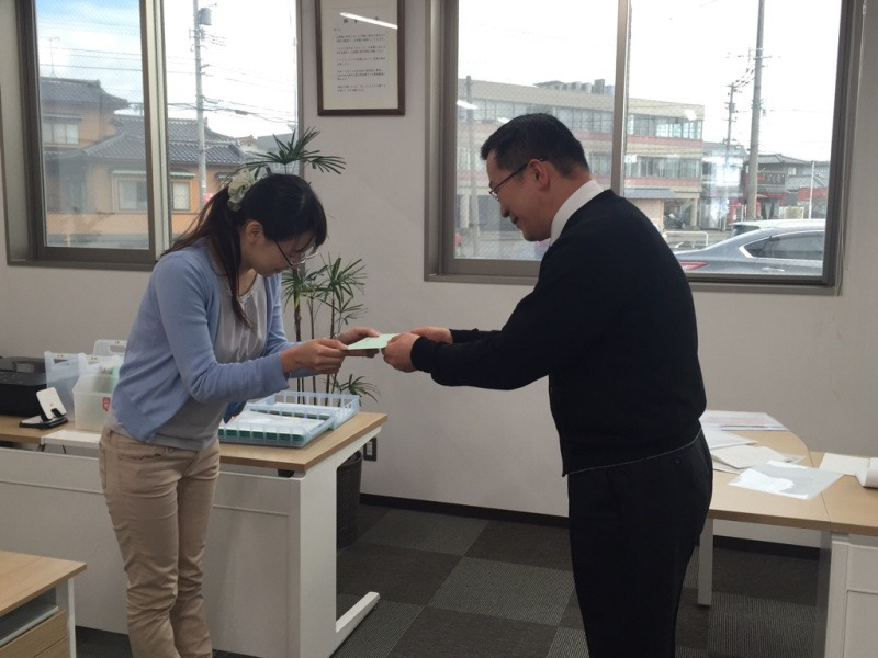 25日といえば心弾む日です そうです(^^♪ お給料日です。フレッシュな二人にも記念すべき日が訪れました。 そう、初任給の支給日。 (?十年もらっているフレッシュでない私も毎回心弾みますが・・) ◆朝礼の最後に・・・ ![]() 赤池は・・・・ 深いお辞儀で感謝 感激![]() 西は・・・・ とびっきりの笑顔で感謝 感激(上田の笑顔も負けていないぞ) 入社して間もないお二人、きっと毎日が緊張の連続でしょう・・・・ だから余計にお金の大切さを実感・きっと一生忘れられない日になるんですかね・・・・ 感謝を忘れず、これからも共に 成長していきましょう・・・・ 番外編 初任給をどう使った?ランキング 1位 両親にプレゼントや食事をご馳走 2位 自分にこれまで頑張ったご褒美 3位 何が起こるかわからない・・貯金する 私たちも初心を忘れず、入社2年目の吉田SPのように、しっかりと家計簿をつけていきたいと思います。 ![]() ![]() |