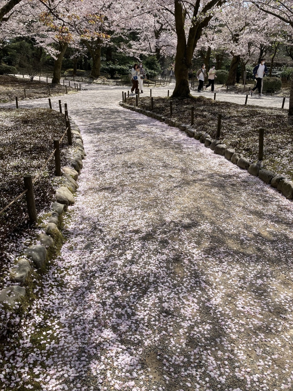 私が足を運んだ時にはすでに葉っぱ混じりではありましたが、 花びらがハラハラと舞い散る様子がとても綺麗でなんだか心が洗われる思いでした。 足元に溜まった花びらの道もまた趣深うございました。