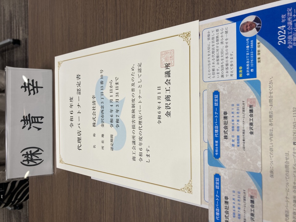 昨年に引き続き、令和6年度も商工会議所扱い損害保険制度の「代理店パートナー」に認定されました。 商工会議所扱い損害保険制度とは、全国商工会議所のスケールメリットにより、低廉な保険料でご加入頂ける制度です。今後もこの制度を広めながらも、「お客様をお守りする」という私どもの使命を全うすべく取り組んでまいります。 能登半島地震からの復興を成し遂げなければならない今、地域の皆様のパートナーであり続けます。 経営リスクの担保や従業員などの福利厚生の充実などなど・・ 是非 清幸にご相談ください。 |